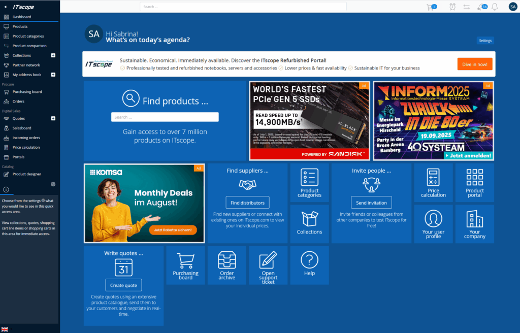 By clicking on the tile Product portal, the corresponding platform page Products will open. Here you can search for products based on categories, but you can also browse through best offers and the most popular products.