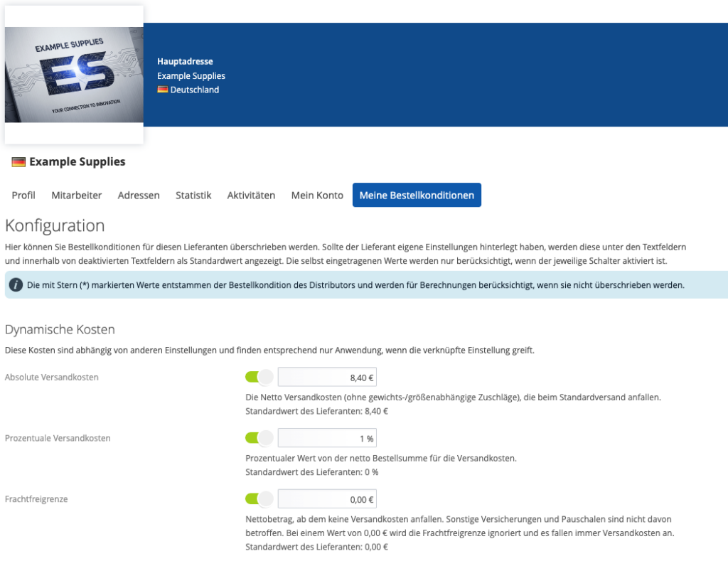Unter diesem Tab kann man die Bestellkonditionen beim jeweiligen Lieferanten konfigurieren. Hat der Lieferant in seiner Konfiguration schon Daten hinterlegt, sind diese dort sichtbar. Es können aber auch die eigenen Bestellkonditionen hinterlegt werden und somit die vom Lieferanten überschrieben werden, sobald die eigenen Kondition aktiviert werden.