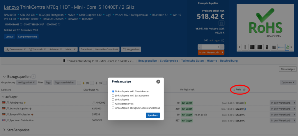 Die hinterlegten Zusatzkosten in den Bestellkonditionen werden bei einem Produkt in der Bezugsquellenliste jeweils dem Preis hinzugefügt, wenn die Preisanzeige auf „Einkaufspreis inkl. Zusatzkosten“ eingestellt ist. Die Umschaltung der Anzeige erfolgt über das Zahnrad bei der Preisspalte. Eine Preissortierung mit Zusatzkosten ist ebenfalls möglich.