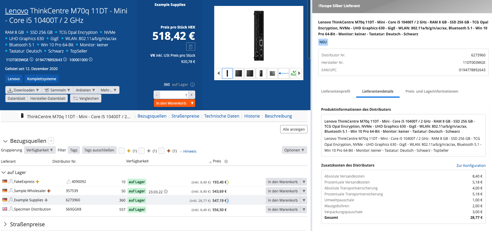 Zusatzkosten in der Bezugsquellenliste