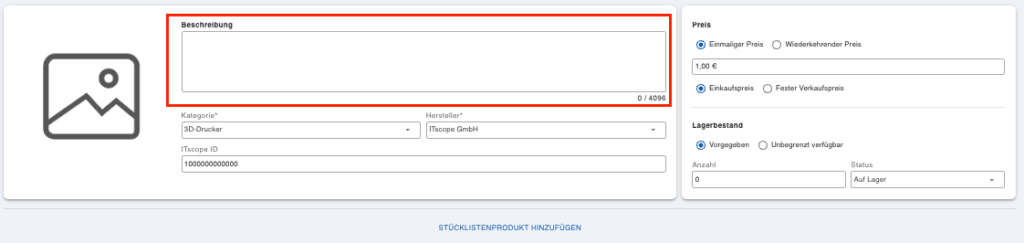 Im Abschnitt Beschreibung können Sie zusätzliche Informationen zum Produkt eintragen, z. B. technische Details, Anwendungsbeispiele oder Hinweise.