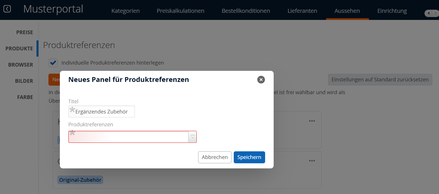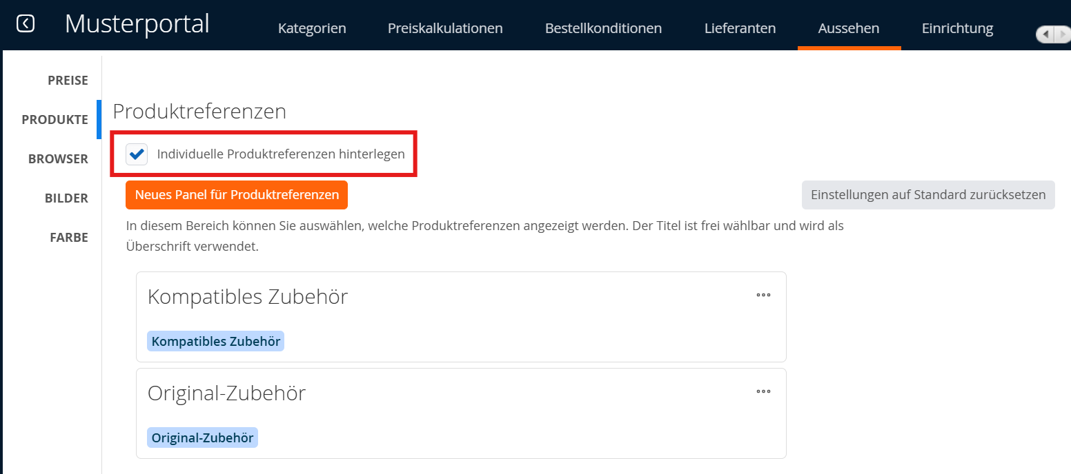 Zusätzlich haben Sie die Möglichkeit die Produktreferenzen, über den Button Neues Panel für Produktreferenzen, mit weiteren Inhalten zu ergänzen.