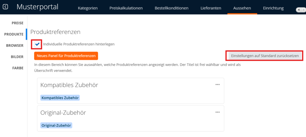 Wenn keine Produktreferenzen angezeigt werden sollen, entfernen Sie den Haken bei individuelle Produktreferenzen hinterlegen. Zusätzlich haben Sie die Möglichkeit über den Button Einstellungen auf Standard zurücksetzen, alle Produktreferenzen, bis auf die Ursprungsreferenzen, Kompatibles Zubehör und Original-Zubehör, zu entfernen.