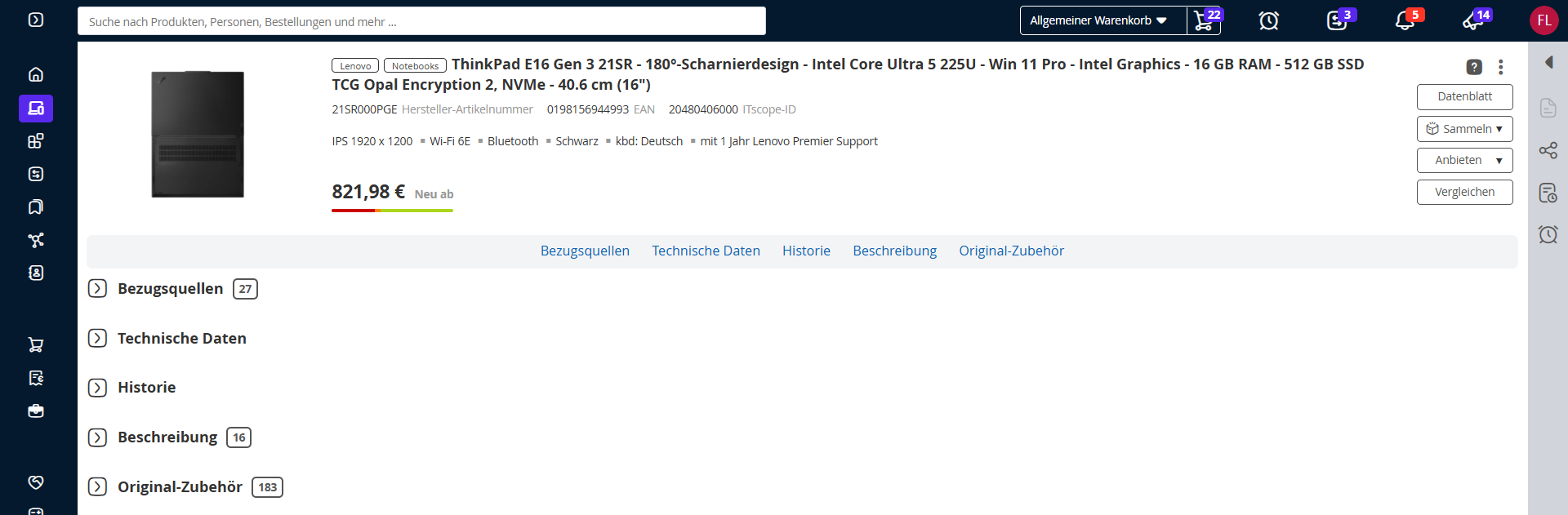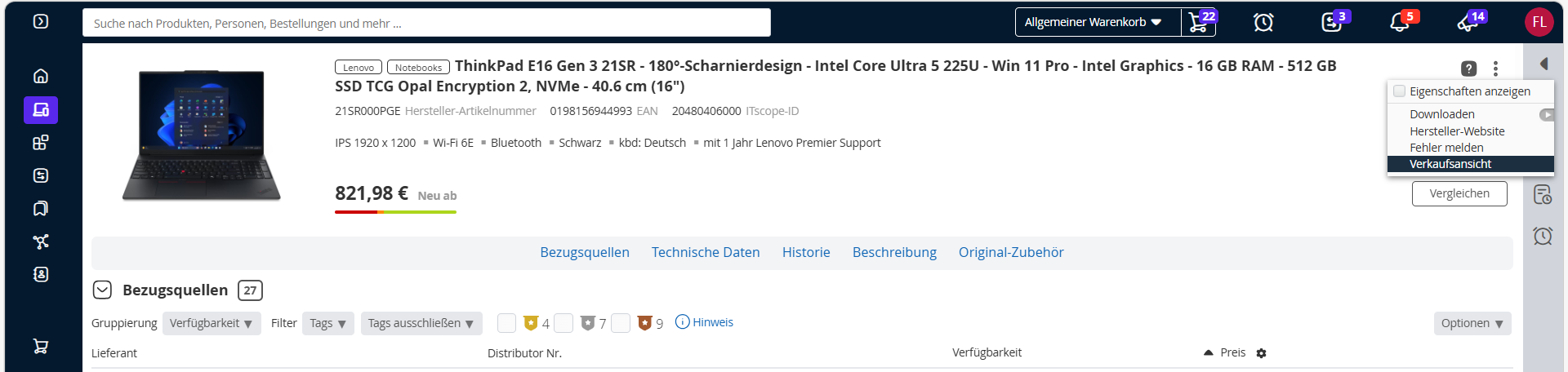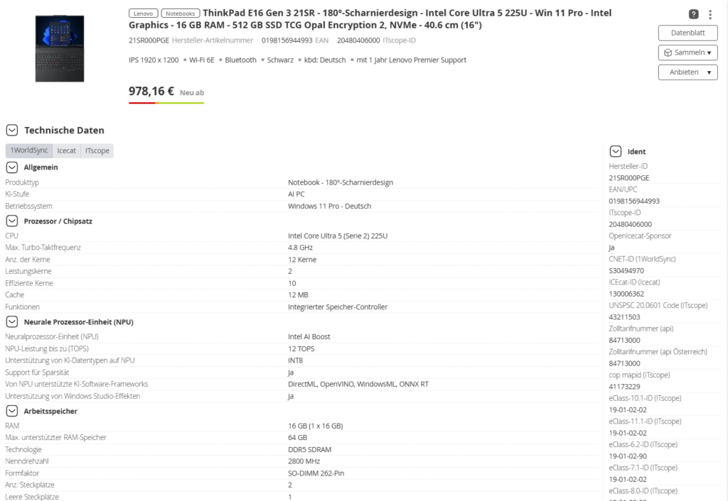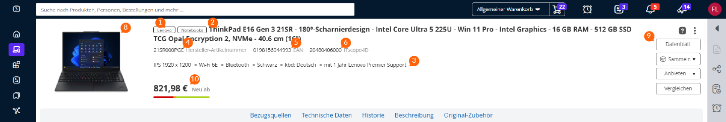 Im Panel „Technische Daten“ werden umfangreiche Informationen zum Produkt angezeigt.