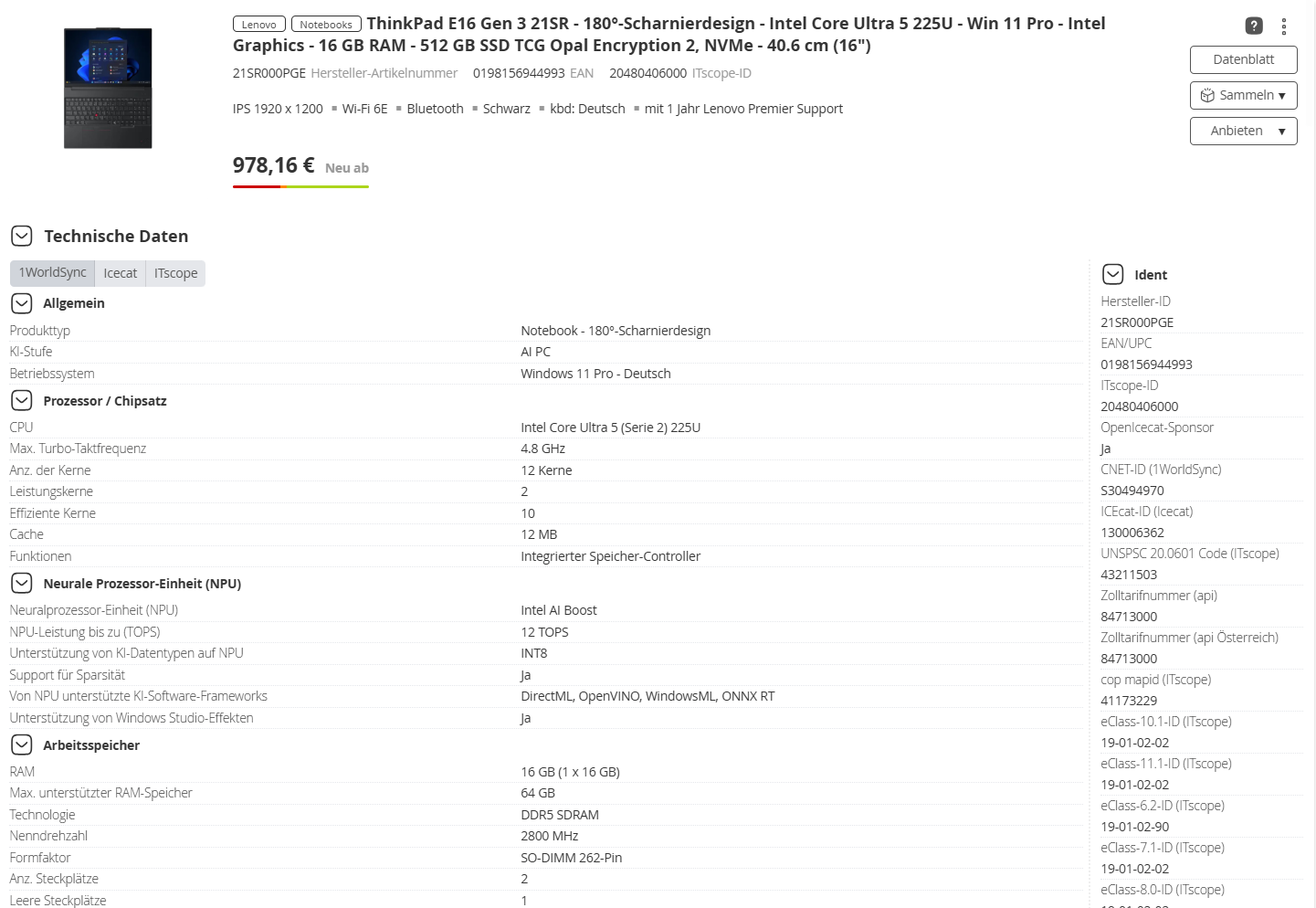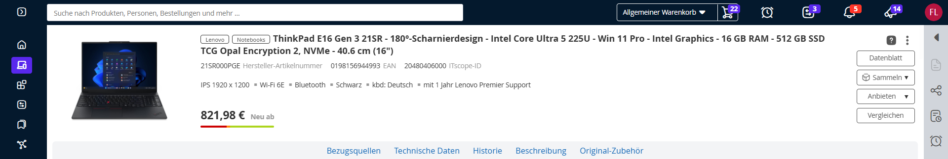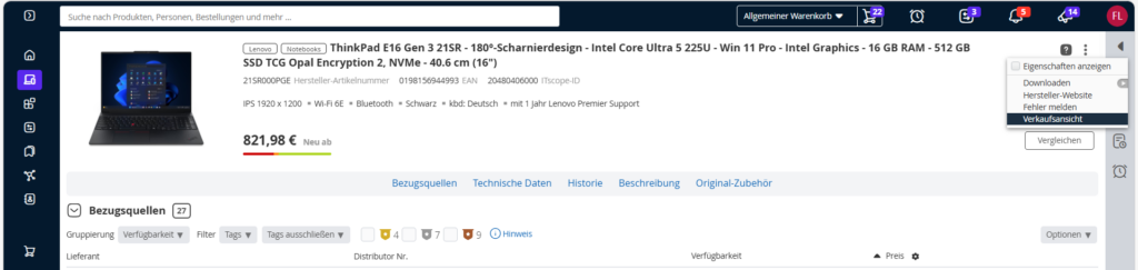 Die Anzeige ähnelt der von der Produktsuche bekannten Darstellung, da Vorschaubild, Produktbezeichner mit Link auf die Produktseite, grundlegende Daten, Preise, sowie ein Hinweis zur Verfügbarkeit erkennbar sind.