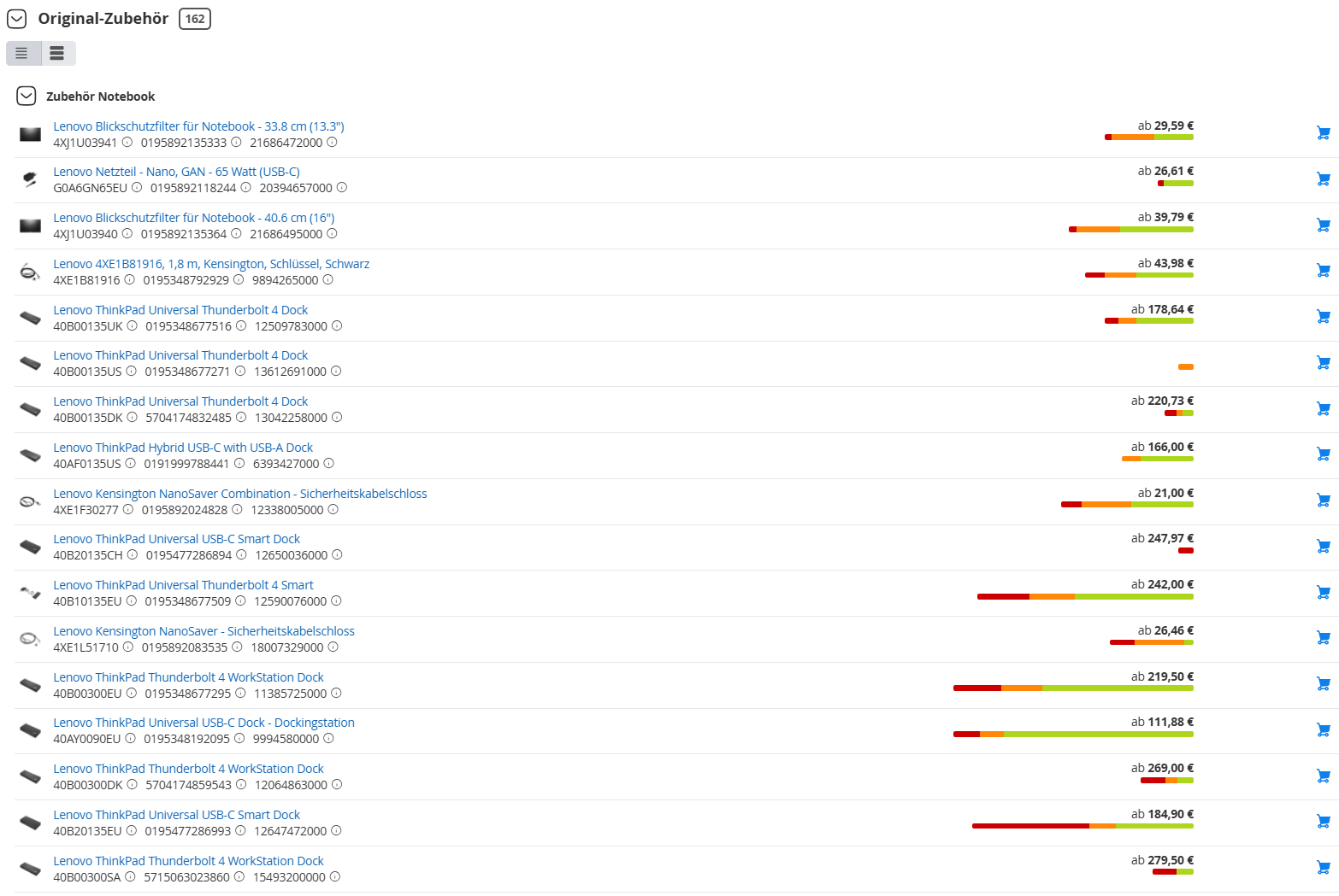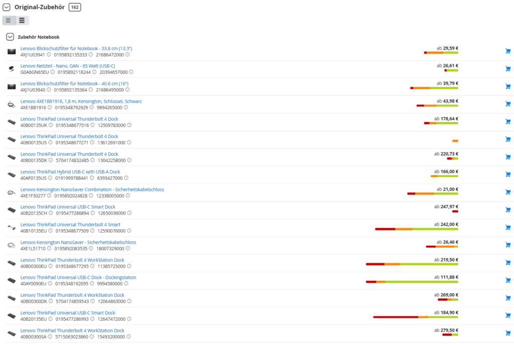 Die Zubehörprodukte werden in einer Liste gruppiert nach Produkttyp angezeigt.
